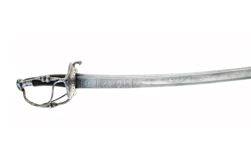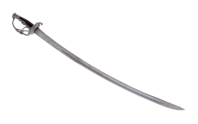 Der Säbel wurde von einem nicht sehr versierten Handwerker um 1840 zusammengestellt. Möglicherweise um der Waffe ein altertümliches Aussehen zu geben, verwendete er das bereits etwas korrodierte Gefäss eines Säbels oder Degens aus dem 1.Viertel des 18.Jahrhunderts und kombinierte dieses mit einem neuangefertigen Knauf und Griff. Die Klinge entspricht verarbeitungs- und längenmässig Klingentypen des 2.Viertels des 19.Jahrhunderts, wie sie für Säbel berittener oder unberittener Offiziere üblich waren. Der einseitig angebrachte, wenig gekonnt ausgeführte Ätzdekor nimmt mit Wappen und Fahne Bezug auf die Schweiz. Vor allem durch die Inschrift, bei der es sich sehr wahrscheinlich um ein Zitat handelt, wird der patriotische Aussage dieser Waffe verstärkt. Anscheinend versuchte der unbekannte «Ätzkünstler» neben den Schweizerwappen mit noch geringerem Erfolg das Wappen des künftigen Waffenbesitzers wiederzugeben. Es können nur Vermutungen angestellt werden in welchem Verhältnis der auf der Quartseite der Klinge in grossen, unregelmässigen Buchstaben festgehaltene Friedrich Meyer von Schauensee zu der Waffe steht. Weil biographische Angaben zu diesem Abkömmling der bekannten Luzerner Patrizierfamilie schwer zugänglich sind, soll sein Lebenslauf kurz skizziert werden: