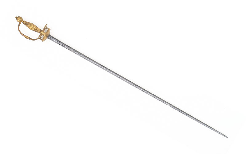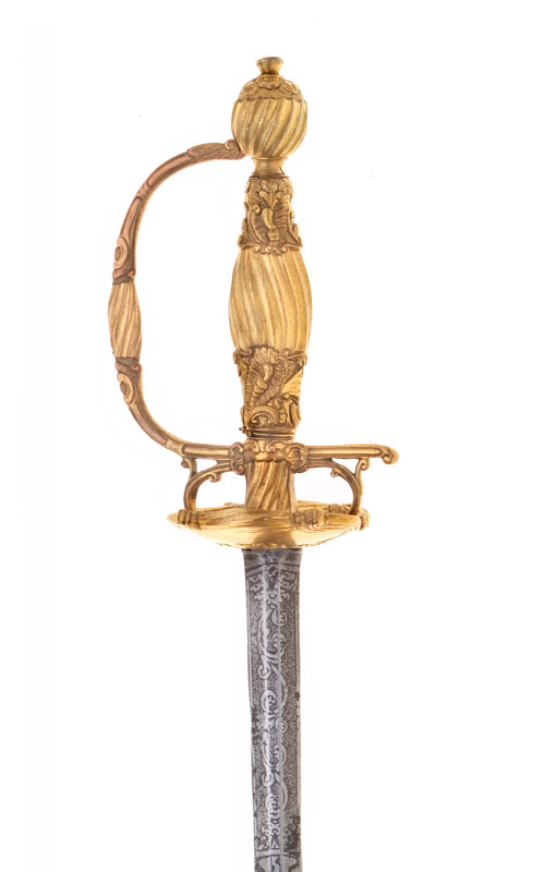 Messinggefäss, aus gegossenen und ziselierten Teilen zusammengesetzt, vergoldet. Kugeliger Knauf, Halsansatz, Vernietknauf. Der Griffbügel mündet in die Griffbasis, Griffbügel und der Parierstangenarm werden durch kurze Stege mit den Ziergriffhaken verbunden. Kleines, schalenförmiges Stichblatt dessen Hälften ebenfalls durch kurze Stege miteinander verbunden werden. Der Knauf, das Mittelstück des Griffbügels, ebenso die Griffbasis und die Griffhülse weisen einen Rillendekor «en torsade» auf, der von Rocaillen begrenzt wird. Das mehrheitlich glatte Stichblatt schmücken im Zentrum rocaillendurchsetzte Ornamente. Die Stichblattborten sind im Mittelteil auch «en torsade» gearbeitet.