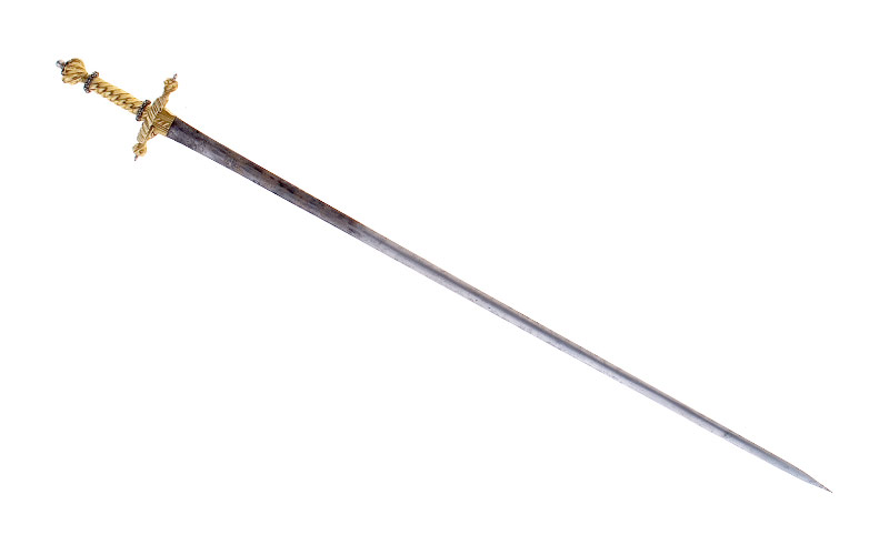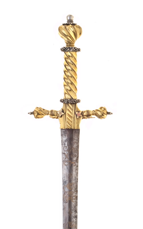Messinggefäss, aus gegossenen und ziselierten Teilen zusammengesetzt, vergoldet, etwas berieben. einige Gefässteile aus Silber. Konischer, feigenförmiger, gewundener Knauf mit acht Zierkehlungen. Die Kanten zwischen den Zierkehlungen sind gespalten. Der Knauf erhebt sich über einer scheibenförmigen Basis. Kugeliger Vernietknauf mit einer Basisrosette aus Silber. Die kurzen, gerundeten Parierstangenarme enden in sechsfach gekehlten, in der Art des Knaufs verarbeiteten Abschlüssen mit Silbernoppen. Der ovale in der flächigen Griffbasis zweifach verschraubte Parierring weist aussen und innen breite Zierrillen auf. Die vierkantige Griffbasis schmückt beidseitig ein vertikales Band mit Zierrillen. Das gegossene Griffstück weist ebenfalls spiralige Zierkehlungen mit gespaltenen Kanten auf. Es wird von zwei silbernen Zwingen in stilisierter Kranzform begrenzt.