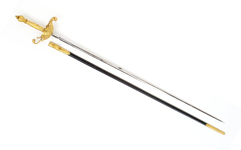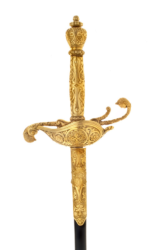 Verschraubtes Messinggefäss, aus gegossenen und ziselierten Teilen zusammengesetzt, vergoldet. Grosser, konischer, vasenförmiger Knauf, gewulstete Basis mit zwei Rillen, der Knaufdekor besteht zur Hauptsache aus vier kreisförmigen Kartuschen, deren Flächen von Kreuzen mit gerundeten Armen eingenommen werden. Grosser, zweistufiger Vernietknauf mit knospenartigem Abschluss, der Vernietknauf dient als Schraube. Den Abschluss der vertikal S-förmig geschweiften Parierstange bilden Frauenköpfe im altägyptischen Stil, Griffbasis beidseitig mit bärtigen Maskarons zwischen Voluten, zwei Ziergriffhaken. Längliches, aus zwei gleich verarbeiteten Hälften bestehendes, schalenförmiges Stichblatt, ein Stichblattende mit Muschelfortsatz, das andere teilt sich und geht in zwei Lappenfortsätze über, deren Enden kleine, stilisierte Delphine schmücken. Der ziselierte ornamentale Dekor auf der Aussenseite des Stichblattes basierend auf Ranken und Blüten ist symmetrisch angelegt, die zentrale Kartusche auf beiden Stichblatthälften entspricht den Knaufkartuschen. Der gravierte und punzierte Dekor auf der Stichblattinnenseite ist mit demjenigen auf der Aussenseite weitgehend identisch. Der massive walzenartige Griff weist terz-und quartseitig den gleichen ornamentalen, aus Ranken und Blüten zusammengesetzten Dekor auf.