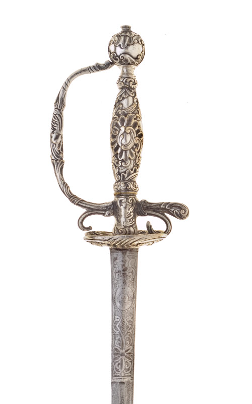 Silbergefäss, aus gegossenen und ziselierten Teilen zusammengesetzt. Kugeliger Knauf, Halsansatz, Vernietknauf. Der Griffbügel mündet in die Griffbasis, kurzer Parierstangenarm, Ziergriffhaken. Stichblatt aus nierenförmigen Hälften bestehend. Alle Gefässteile, auch das kolbenförmige Griffstück, weisen einen Dekor bestehend aus Blattwerk und Rocaillen auf.