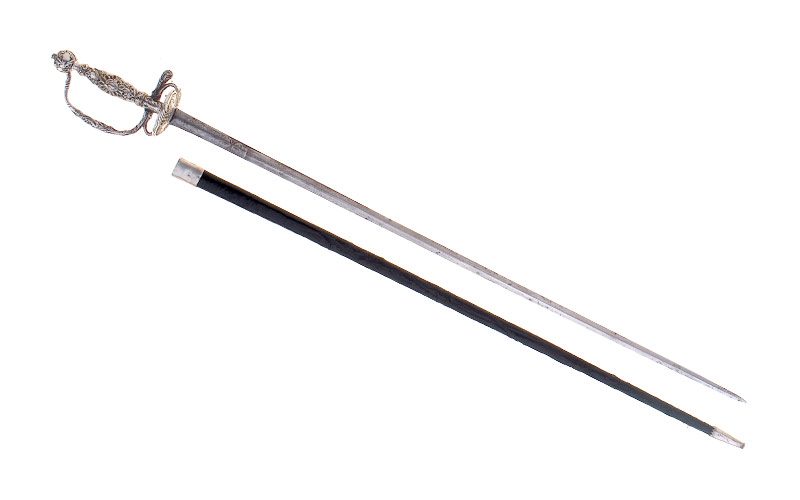 Zweischneidige Klinge (Länge 69,7 cm, Breite 1,9 cm), im Ansatzbereich linsenförmiger, dann sechskantiger Querschnitt, Ätzdekor sowie eingeschliffene achtblätterige Rosette. Schwarze Lederscheide defekt, Alterungsspuren, Silbergarnitur, Mundblech mit Tragknopf, Stiefel.