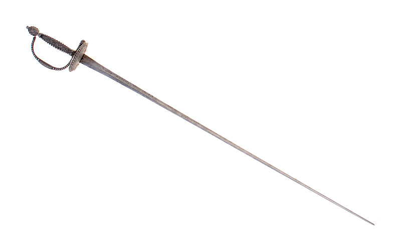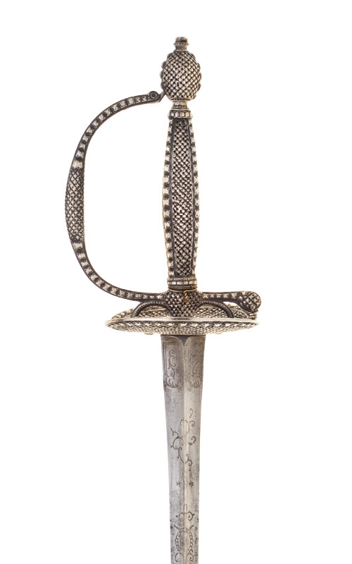 Silbergefäss, aus gegossenen und ziselierten Teilen zusammengesetzt. Olivenförmiger Knauf, konische Basis, Vernietknauf. Der Griffbügel mündet in die Griffbasis, der Parierstangenarm endet in einem gerundeten Abschluss, zwei Ziergriffhaken, ein Haken mit zwei verwischten Marken. Das Stichblatt besteht aus nierenförmigen Hälften, vierkantiger massiver Griff. Der Knauf, die Griffflächen, die Griffbasis und das Stichblatt weisen einen regelmässigen Dekor bestehend aus einem sehr feinen flechtwerkartigen Muster mit vielen Punktdurchbrechungen auf. Die beiden Seitenkanten des Knaufs, die Griffkanten, der Griffbügel samt Parierstange, auch die Stichblattbordüren sind diamantiert.
