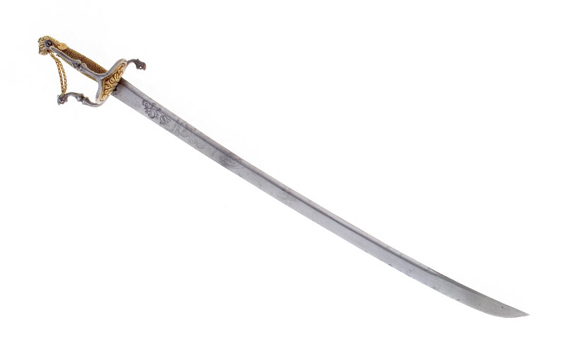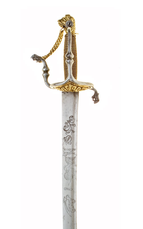 Eisengefäss, gegossener Löwenkopfknauf aus Messing, vertikal S-förmige Parierstange aus Rundeisen, quartseitig mit Daumenring. Die Parierstangenarme enden in einem flachen Dekorelement, das knaufwärts gebogene Ende wird durch eine Messingkette mit dem Knauf verbunden. Das terzseitige Stichblatt besteht aus einem getriebenen Messingblech mit einfachem ornamentalem Dekor in einer Rundeisenfassung. Der im Knauf verschraubte Seitenbügel mündet in die Stichblattfassung und weist wie einer der beiden Parierstangenarme als Dekor ein kleines Kugelpaar auf. Griff mit Messingdrahtwicklung, Türkenbünde.