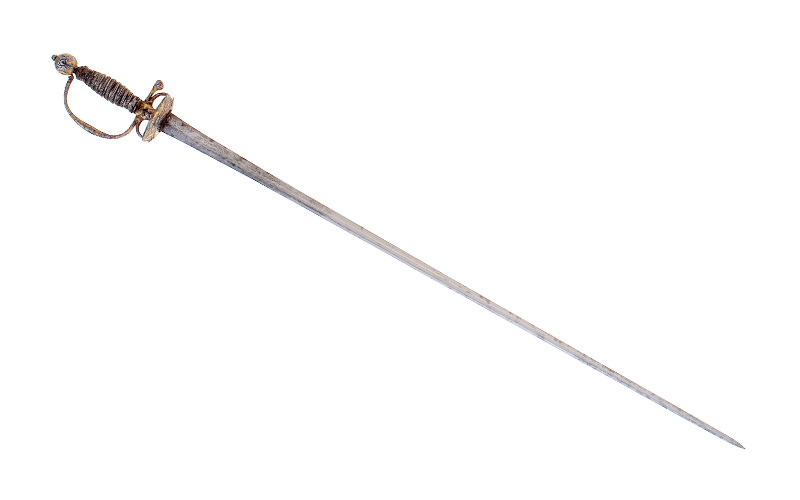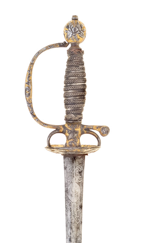 Eisengefäss, ziseliert und teilvergoldet. Kugeliger Knauf, konische Basis, Vernietknauf. Der Griffbügel mündet in die Griffbasis, der Parierstangenarm endet in einem kugeligen Abschluss, zwei Ziergriffringe, Stichblatt aus nierenförmigen Hälften bestehend. Auf dem Knauf beidseitig Darstellung von Trophäen, die Terzseite der Griffbasis sowie das Stichblatt mit Ausnahme einer aussenliegenden Stichblatthälfte wurden ebenfalls mit antikem und zeitgenössischem Kriegsgerät geschmückt. Eine Stichblatthälfte zeigt einen Dudelsack samt breitrandigem Hirtenhut. Die verbliebenen Flächen des Gefässes bedecken Blatt- und Rankenwerk sowie Rocaillen. Der blank belassene minim reliefierte Dekor hebt sich vom vergoldeten und fein punzierten Grund ab. Griff mit kombinierter silberner Bänder-Drahtwicklung, geflochtene Abschlüsse ergänzt.