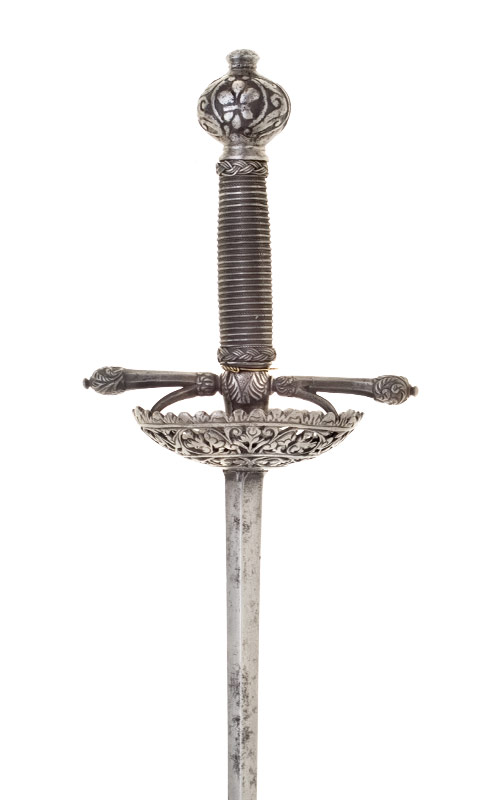 Eisengefäss, gequetschter, kugeliger Knauf mit konischem Ansatz, Vernietknauf. Beidseitig gleicher geschnittener Dekor: im Zentrum eine grosse Lilie in kartuschenartiger Fassung, seitlich Bandornamente. Achtkantige Parierstangenarme mit länglichen, gerundeten Abschlüssen, die Armansätze und Abschlüsse weisen einen geschnittenen Blattdekor auf. Beidseitig der walzenförmigen Griffbasis kurze Griffhaken. Das runde, schalenförmige Stichblatt ist durchbrochen gearbeitet, die Stichblattfläche wird durch eine konzentrische, schmale Linie in zwei Dekorbahnen von unterschiedlicher Grösse aufgeteilt, welche von Blattranken eingenommen werden. Das geschnittene Blattrankenmotiv ist nur auf der Aussenseite des Stichblatts sichtbar, das Stichblattinnere ist glatt . Fein gelappter Stichblattrand. Sechskantiger Griff mit Eisendrahtwicklung, Türkenbünde.