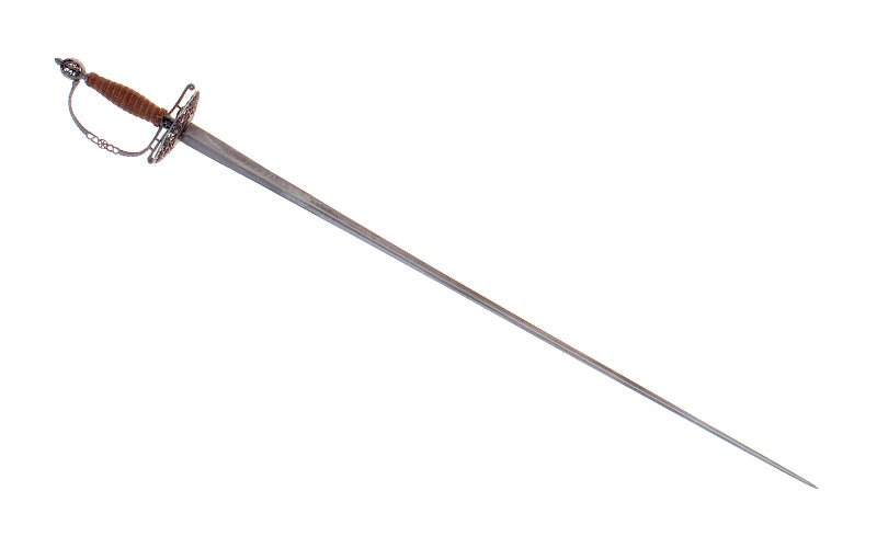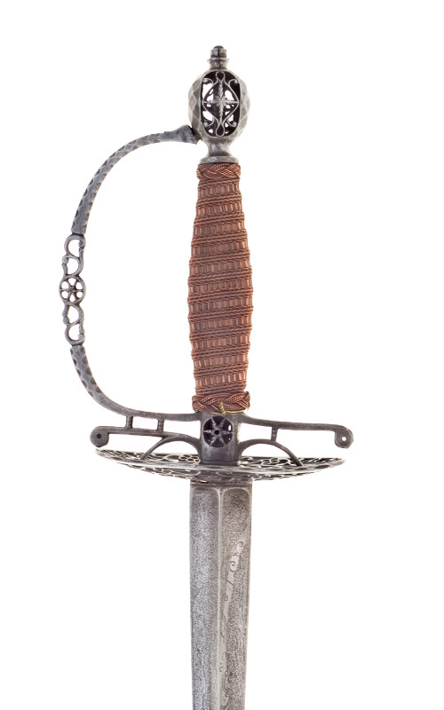 Stahlgefäss, aus geschmiedeten, nachträglich geschliffenen und durchbrochen gearbeiteten Teilen zusammengesetzt. Olivenförmiger Knauf mit länglichem Halsansatz über einer scheibenförmigen Basis. Terz- und Quartseite des Knaufs mit durchbrochener ovaler, ornamental gegitterter Öffnung, Seitenflächen des Knaufs facettiert, Vernietknauf. Der flache, vierkantige, im Kantenbereich facettierte Griffbügel mündet in die mit einer Rosette durchbrochene Griffbasis, der Mittelteil des Griffbügels ist durchbrochen gearbeitet. Die Parierstange besteht aus zwei versetzt platzierten, feinen, Vierkantarmen, welche in kleinen Scheibchen enden. Zwischen dem Griffbügel und einem Parierstangenarm, ebenso zwischen dem zweiten Parierstangenarm und einem der beiden Zierbügel, bestehen Stegverbindungen. Ovales, im Bereich der Klinge volles, dann durchbrochen gearbeitetes Stichblatt mit symmetrisch angelegtem Gitterwerk. Griff mit kunstvoller Kupferdrahtwicklungen von unterschiedlicher Verarbeitung, Türkenbünde.