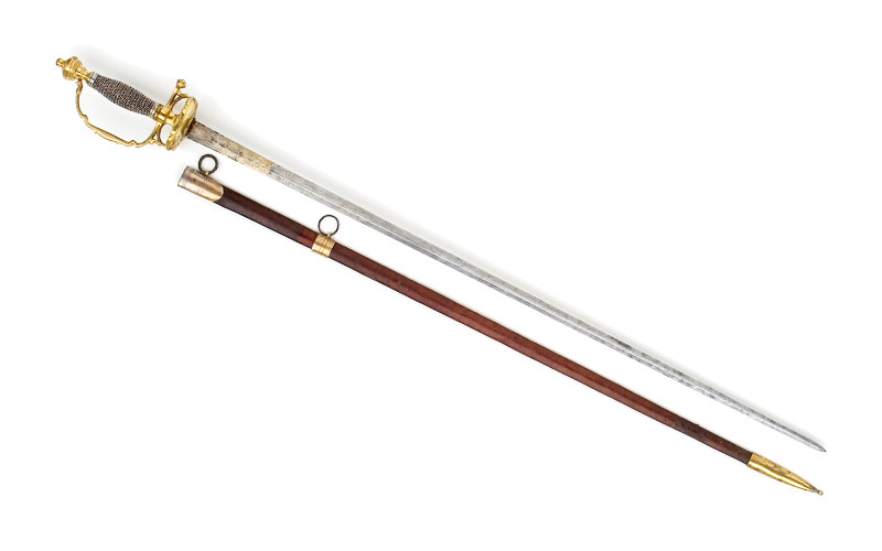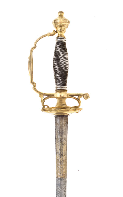 Messinggefäss vergoldet, berieben. Vasenartiger Knauf, grosser kugeliger Vernietknauf, der sechskantige, barock fassonierte Griffbügel mündet in die Griffbasis. Der ebenfalls sechskantige Parierstangenarm verdickt sich gegen das Ende kugelförmig. Beidseitig der Griffbasis Zierbügel, die auf Stichblatthöhe enden und durch kurze Stege mit dem Griffbügel oder der Parierstange verbunden sind. Das Stichblatt besteht aus Hälften leicht unterschiedlicher Grösse, die Ränder sind symmetrisch fassoniert. Im Zentrum der Stichblattinnenseite erhebt sich der viereckige, an den Rändern gelappte Sockel der Griffbasis. Griff mit Silberdrahtwicklung, Silberzwingen.