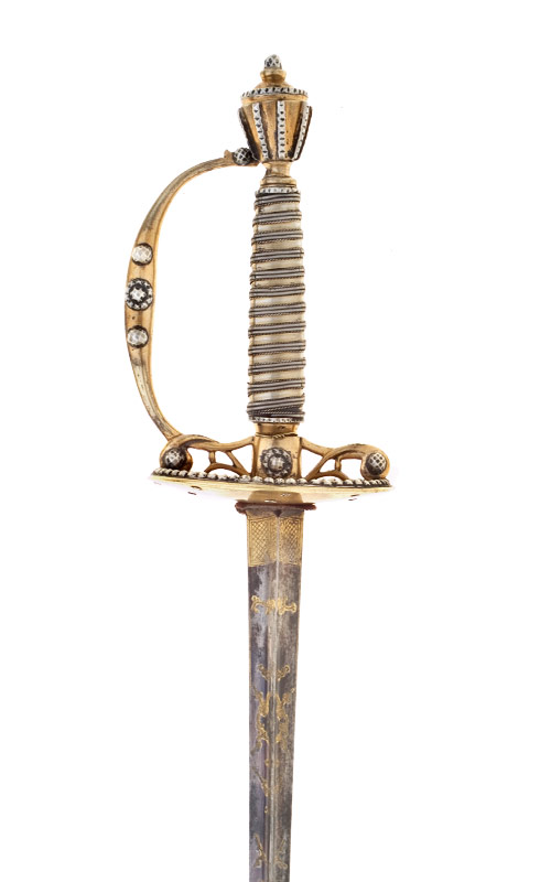 Messinggefäss, aus gegossenen Teilen zusammengesetzt, vergoldet, Silbereinlagen. Urnenförmiger Knauf, sockelartiger Hals, die Seitenfläche wurde mit acht genoppten und facettierten Silberstäbchen belegt. An der Basis der Niethälfte ein dünner, genoppter und facettierter Silberring, als Abschluss des Vernietknaufs dient eine facettierte Halbkugel aus Silber. Der gerundete, eher flache Griffbügel, welchen im Mittelteil drei facettierte Silbereinlagen schmücken, mündet in die Griffbasis. Zwischen den geschwungenen Parierstangenarmen, deren Ende beidseitig durch eine facettierte Silberhalbkugel betont werden, und einem an der Griffbasis fixierten Zierbügel bestehen zwei Stegverbindungen. Ovales Stichblatt, Unterseite glatt, Oberseite dekoriert. Auf der Oberseite dient ein im Randbereich aufgenieteter, schmaler Silberreif mit facettierten Noppen als Bordüre. Im Zentrum des Stichblatts weist die mit einem Strahlenmuster durchbrochen gearbeitete messingene Unterlagsscheibe eine ähnliche Silberbordüre auf. Vier Rosetten aus facettierten Silberhalbkügelchen wurden kreuzweise angeordnet auf der Stichblattinnenseite befestigt. Griff mit unterschiedlich verarbeiteter, teilweise vergoldeter Silberdraht-oder Silberbandwicklung.
