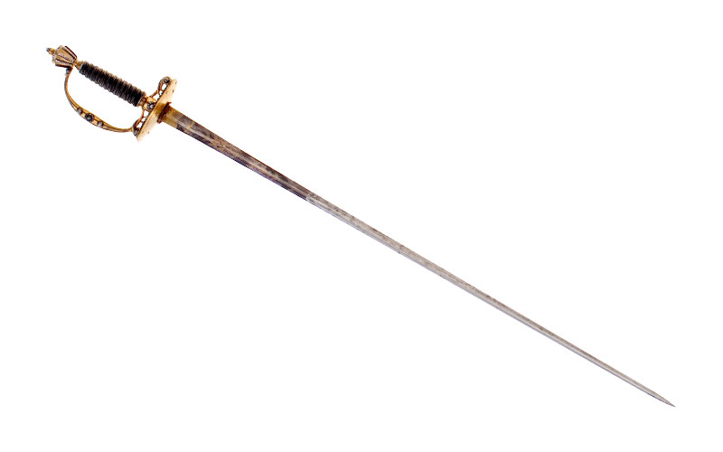 Dreikantige Klinge, etwas fleckig (Länge 76,2 cm, Breite 2,2 cm), tief gekehlte Seitenflächen, Ansatzdrittel gebläut, berieben, vergoldeter Ätzdekor, Rankenwerk, Ornamente.