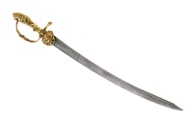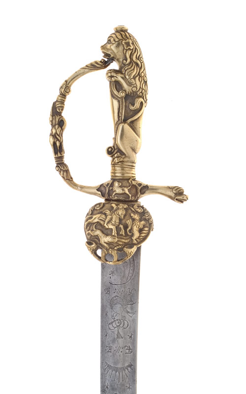 Messinggefäss, massives gegossenes Griffstück in Form eines aufrecht auf seinen Hinterläufen sitzenden Löwen, der eine schildförmige Kartusche mit leerem Feld hält, Vernietknauf. Der Griffbügel, dessen Mittelteil eine stilisierte Samsondarstellung einnimmt, mündet in die Parierstange. Der Parierstangenarm endet in einem Phantasietierkopf. Griffbasis beidseitig mit einfachen Löwendarstellungen. Am stark ortwärts gebogenen, gewölbten, ovalen Stichblatt betonen zwei Jagdhörner den unteren Abschluss, Stichblattdekor: ein berittener, von seinem Hund begleiteter Jäger verfolgt einen Löwen.