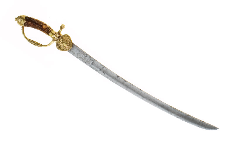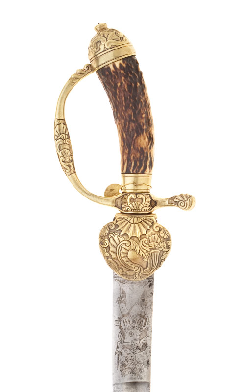 Messinggefäss, Vergoldungsspuren, Knaufkappe, Vernietknauf, Griffbügel in die Parierstange mündend, stark ortwärts gebogenes Stichblatt. Alle Gefässteile terzseitig mit Rocaillendekor, Quartseite glatt belassen. Hirschhorngriff, eine Zwinge.