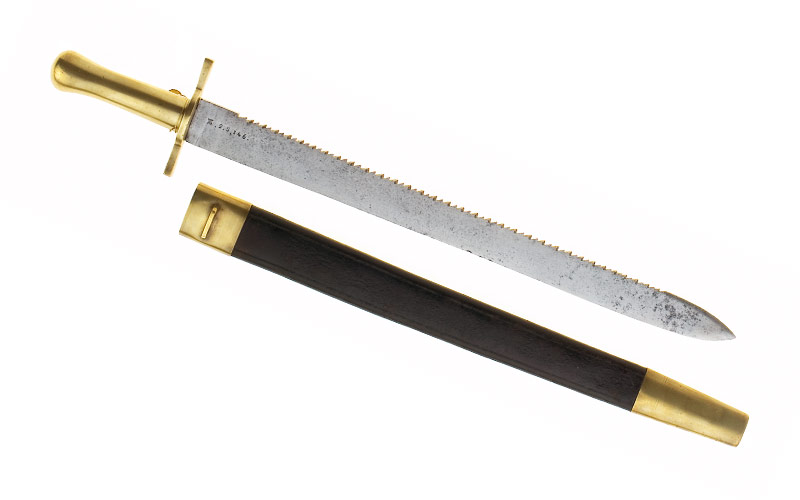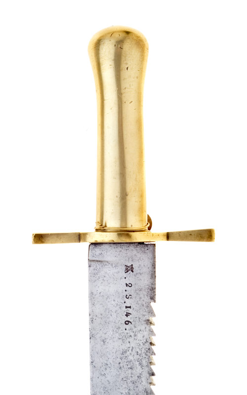 Messinggefäss, massiver vierkantiger, kolbenförmiger Griff (Guss), schmale Seitenkanten, vierkantige Parierstange mit breiter werdenden Armen und ovaler Basis. Volle Sägerückenklinge, etwas rostfleckig (Länge 51,8 cm, Breite 4,2 cm), volle Wurzel, im Ort zweischneidig, mit Punzen gezeichnet: «AA» von Krone überhöht (= Auszüger-Armatur, Kt.Bern), « 2.S.» (= 2.Sappeurkompanie), «146» (Waffe Nr.146). Schwarze Lederscheide, Messinggarnitur, Mundblech mit Riemenbügel, Stiefel.