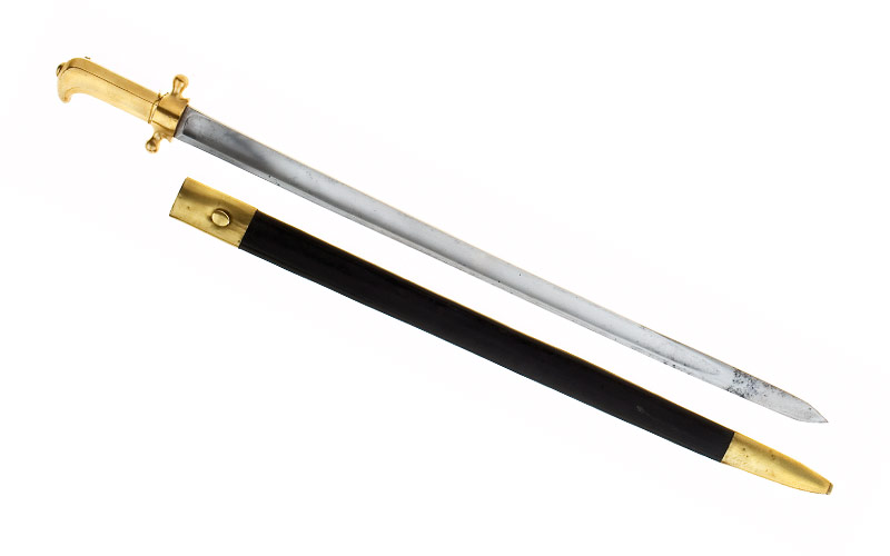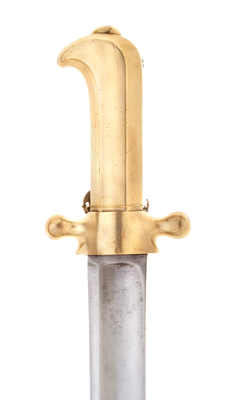 Messinggefäss, hohler, achtkantiger Griff mit Schnabelende, Vernietknauf. Die Quartseite des Griffes weist eine langrechteckige Öffnung auf, darüber eine verschraubte Arretierfeder zur Fixation der Waffe auf dem am Lauf angeschmiedeten Weidmesserdorn. Parierstange mit massiver Basis und kurzen, kugeligen Pariestangenarmen. Geschlagene Waffennr.101 auf der Parierstange, Griff mit neuerer Waffennr.9.