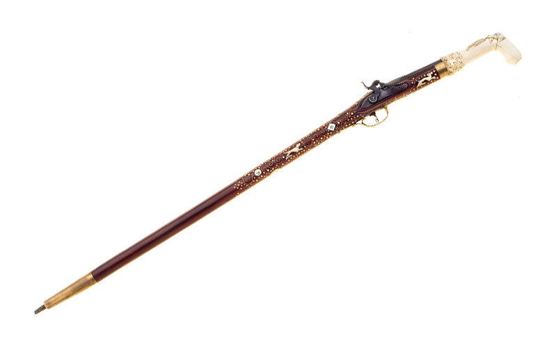 Ausziehbarer, gewinkelter Stockgriff, der aus zwei beschnitzten Elfenbeinstücken zusammengesetzt wurde, feine Risse. Griffdekor: über dem Winkelteil erscheint ein Hundekopf mit Glasaugen, der einen erbeuteten Vogel im Rachen hält. An der Griffbasis ornamentaler Blattdekor. Zur Befestigung des Griffes in der Pistole, die den Abschluss des Berghäckchens bildet, dienen zwei lange Stifte aus Holz und Metall. Die in den Schaft eingelassene Pistole verfügt über einen runden Eisenlauf ( Länge 11,8 cm) mit achtkantigem Kammerteil, Kal.10 mm, seitlich angeschweisster, kugeliger und gekanteter Pulversack. Steinschloss perkussioniert, Schlossplatte und Hahn flach. Messinggarnitur bestehend aus Abzugbügel, Seitenblech und Mündungsband. Langer, stockartiger Nussbaumschaft, ovaler Querschnitt, obere Hälfte verbeint und mit Perlmuttplättchen intarsiert. Beindekor: gerollte und gewellte Linien, Fratzenmedaillons, Flächen mit Punkten bestreut, Hunde, Hasen verfolgend, als unterer Schaftabschluss dient ein grosser Messingstiefel mit einem kurzen, zentralen Eisendorn.