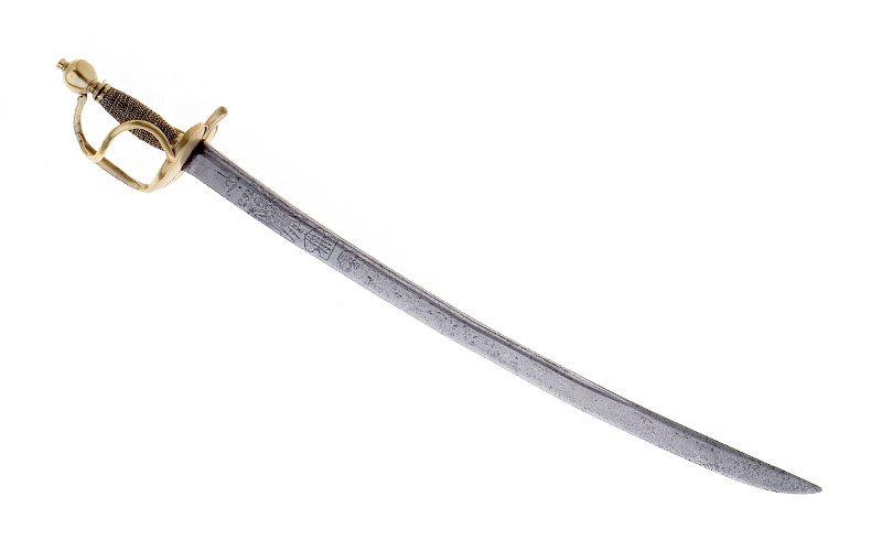 Rückenklinge (Länge 61,4 cm, Breite 3,1 cm), Hohlschliff im Rückenbereich, im Ort zweischneidig, Grootspitze. Ätzdekor: Terzseite - Jahrzahl 1763, darüber eine grosse Trophäe sowie ein nicht identifizierbares, von einer Krone überhöhtes Wappen. Quartseite - Devise, «Für Gott und Das Vatterland», darüber auf einem Sockel ein aufrecht stehender Löwe, der in der rechten Pranke einen Säbel hält, ebenfalls von einer Krone überhöht.