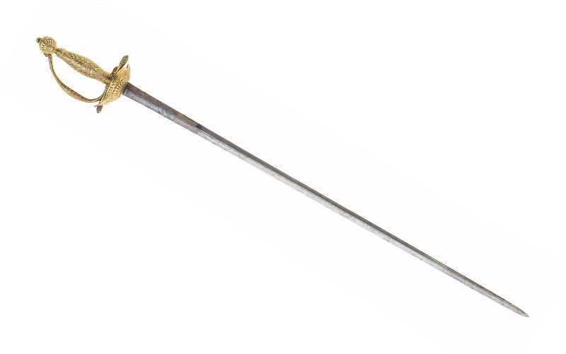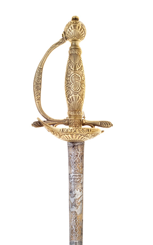Messinggefäss, aus gegossenen und ziselierten Teilen zusammengesetzt. Kugeliger Knauf, gekehlter Halsansatz, Vernietknauf. Der im Knauf verschraubte Griffbügel mündet in die Griffbasis. Parierstangenarme mit etwas verdickten Enden, zwei Ziergriffhaken. Herzförmiges Stichblatt, das sich gegen den Griffbügel teilt und in Lappenfortsätze übergeht. Der Knauf, der massive Griff, die Griffbasis und das Stichblatt weisen einen Rocaillendekor vor fein punziertem Grund auf.