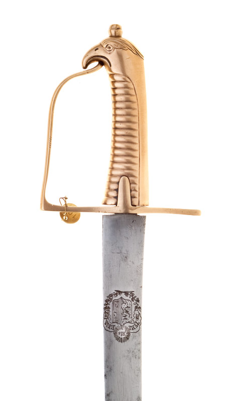 Rötliches Messinggefäss, aus gegossenen und geschmiedeten Teilen zusammengesetzt. Der Rücken des massiven Griffstücks ist in der Art einer Griffkappe gearbeitet und verfügt über einen mit neunzehn Rillen versehenen Griffteil. Dieser endet in einem Adlerkopf mit Vernietknauf. Der flache, gewinkelte Griffbügel mündet in die ebenfalls flache, jedoch vierkantige Parierstange mit knaufwärts gerichteten halben Mitteleisen.