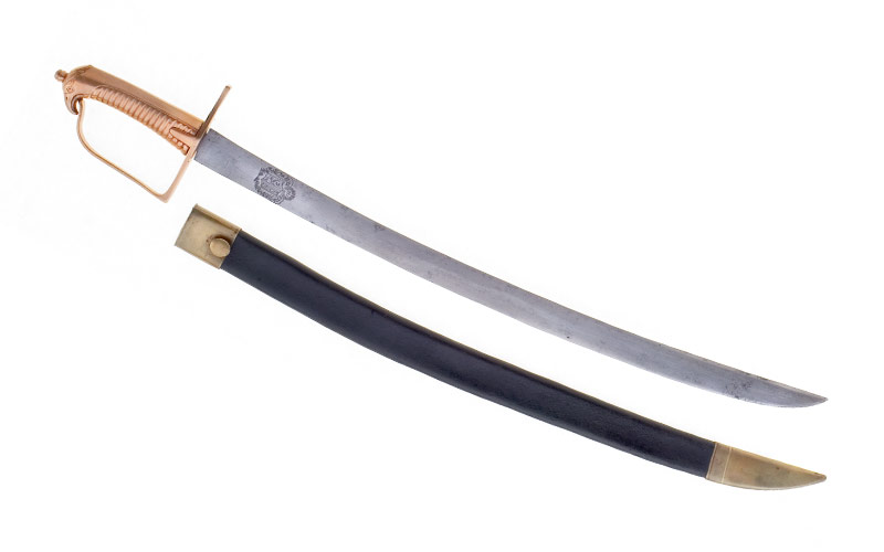 Der Säbel dessen Griff in einem Adlerkopf endet, dem Wappentier der Stadt und des Kantons Genf, basiert auf dem französischen Modell von 1767 für Grenadiere. Das einfache Gefäss besteht aus zwei Gussstücken, dem Griffteil und dem gewinkelten Griffbügel. Die knaufwärts gerichteten Mitteleisen dienen zur Fixierung des Griffstücks. Vor allem das gegossene mit 19 bis 20 Rillen versehene Griffstück erwies sich im Vergleich zu den bisherigen, reparaturanfälligen, drahtumwickelten Holzgriffen als robust und praktisch. Neben den vollen Säbelklingen fanden für diese Genfersäbel auch Klingen mit breiten Hohlschliffen Verwendung, welche man zuweilen zusätzlich mit Rückenkannelüren ausstattete. Waffen, die gebläute Klingen und einen vergoldeten Ätzdekor aufweisen, dürften für Unteroffiziere bestimmt gewesen sein. Auf dem vorliegenden Exemplar wurde die Devise anstatt mit dem offiziellen «POST TENEBRAS LUX» mit «IN TENEBRIS LUX» wiedergegeben, das übliche «IHS» (IESUS HOMINUM SALVATOR) erscheint fälschlicherweise als «HIS».