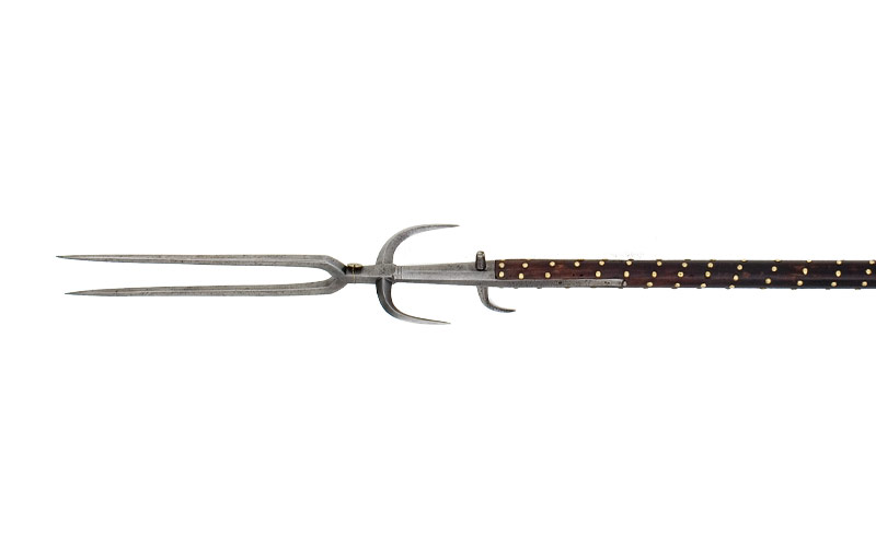 Gabeleisen mit zwei vierkantigen, in der Front flachen Zinken (Länge 29,9 / 30,2 cm) mit einem kurzen, vierkantigen, quaderförmigen Ansatz. Beidseitig dieses Ansatzes schaftwärts gebogene, vierkantige, grosse Haken. Achtkantige, konische Tülle, der einseitige, schaftwärts gebogene Parierhaken ist in dem gegenüberliegenden Noppen vernietet. Zwei kurze Schaftfedern, geschwärzter Rundschaft, beide Schaftenden weisen einen Ziernägeldekor auf, Nägel mit bombierten Messingköpfen, konischer Eisenstiefel.