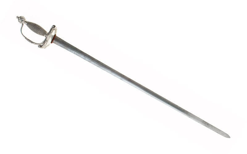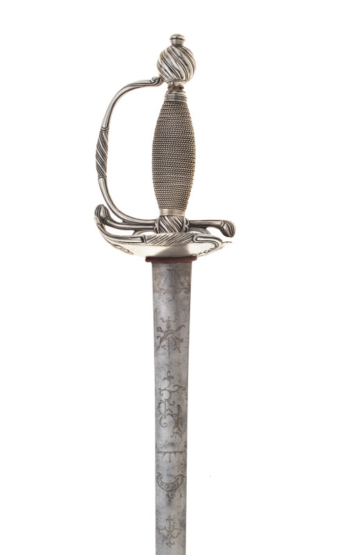 Silbergefäss, aus gegossenen und ziselierten Teilen zusammengesetzt, Kugelknauf, Vernietknauf. Der Griffbügel mündet in die Griffbasis, Parierstangenarme mit ort- und knaufwärts gerichteten, knospenartig verdickten Enden, zwei Ziergriffhaken. Ovales, breit gebörteltes Stichblatt, das sich unter dem Griffbügel teilt und in Lappenfortsätze übergeht, Rocaillendekor. Der Knauf, das Griffbügelmittelstück, die Griffbasis sowie ein Teil der Stichblattborten weisen einen Rillen- und Bänderdekor « en torsade» auf. Griff mit Silberdrahtwicklung, zwei Zwingen.
