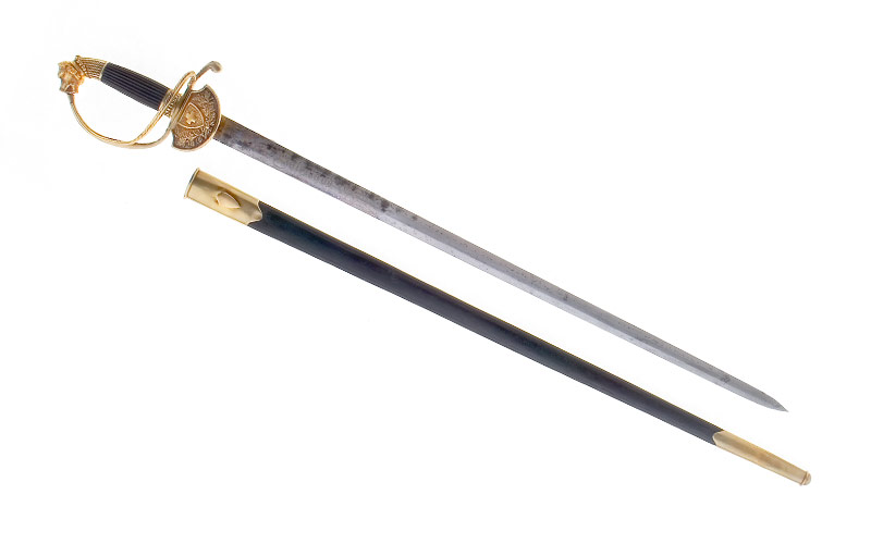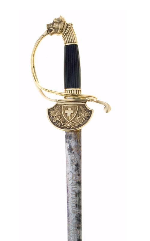 Messinggefäss, aus gegossenen und ziselierten Teilen zusammengesetzt, vergoldet, berieben. Knaufkappe, gerundeter, vertikal gerillter Ansatz mit einem grossen, plastisch gearbeiteten Bärenkopf als Abschluss. Der vierkantige Griffbügel sowie der gerundete Seitenbügel münden in die Parierstange mit einem leicht ortwärts gebogenen, walzenförmigen Ende. Der Dekor des ortwärts gebogenen, schildförmigen Stichblatts besteht aus einem grossen Spitzschild mit Schweizerwappen zwischen Eichenlaubzweigen. Gerundeter Ebenholzgriff mit vertikalen Rillen, Zwinge ebenfalls mit vertikalen Zierrillen.