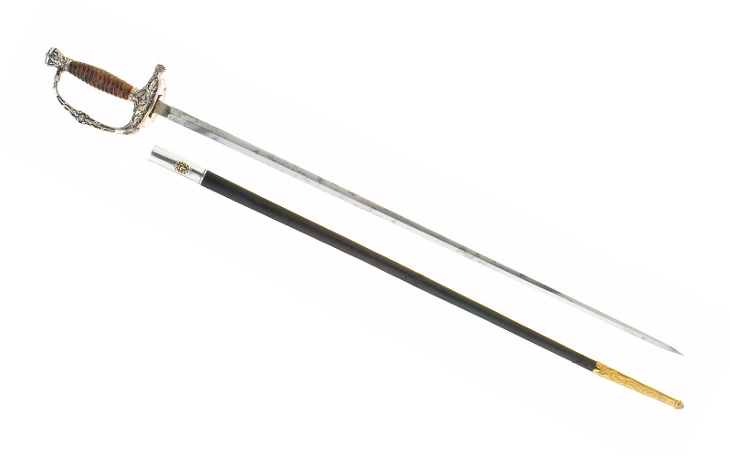 Zweischneidige Klinge (Länge 78,8 cm, Breite 1,9 cm), volle Wurzel, dann rhombisch. Schwarze Lederscheide, Silbergarnitur, Mundblech mit Tragknopf, alt ergänzter Stiefel aus Messing.