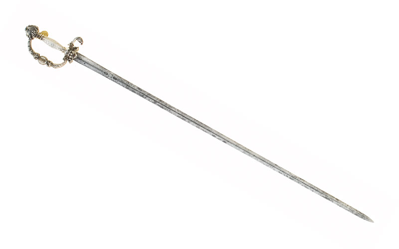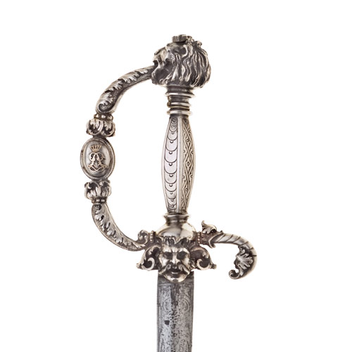 Silbergefäss, aus gegossenen und ziselierten Teilen zusammengesetzt. Löwenkopfknauf, dreifach gerillter Halsansatz, rosettenförmiger Vernietknauf. Reliefiert dekorierter Griffbügel, im Mittelteil ein bombiertes ovales Medaillon, Dekor: beidseitig die aufgesetzten, jeweils gegenständig angeordneten, vergoldeten von einer Krone überhöhten Buchstaben «L» ( König Ludwig II., reg. 1864-1886). Die Griffbasis zeigt beidseitig Männerköpfe mit grossen Schnäuzen,, ebenso das Ende des kurzen, ortwärts gebogenen Parierstangenarms. Massiver, sechskantiger, kolbenförmiger Griff mit graviertem ornamentalem Dekor.