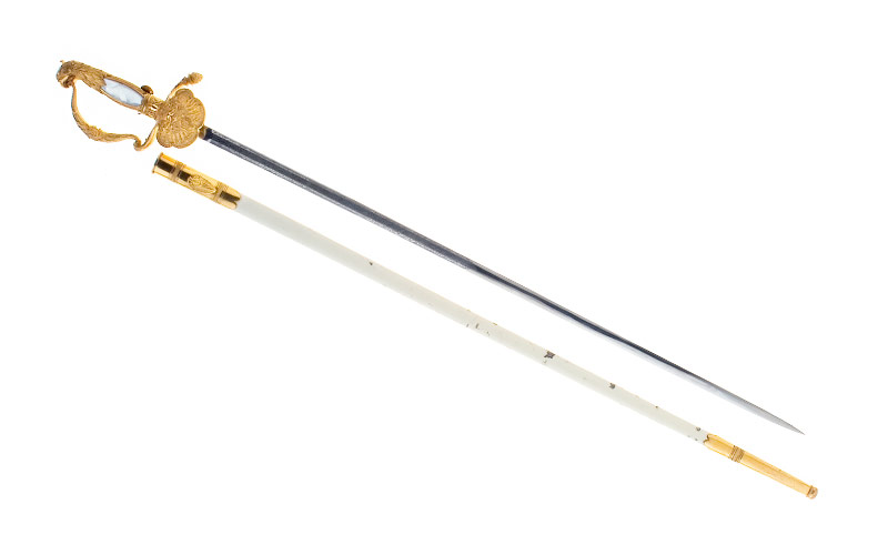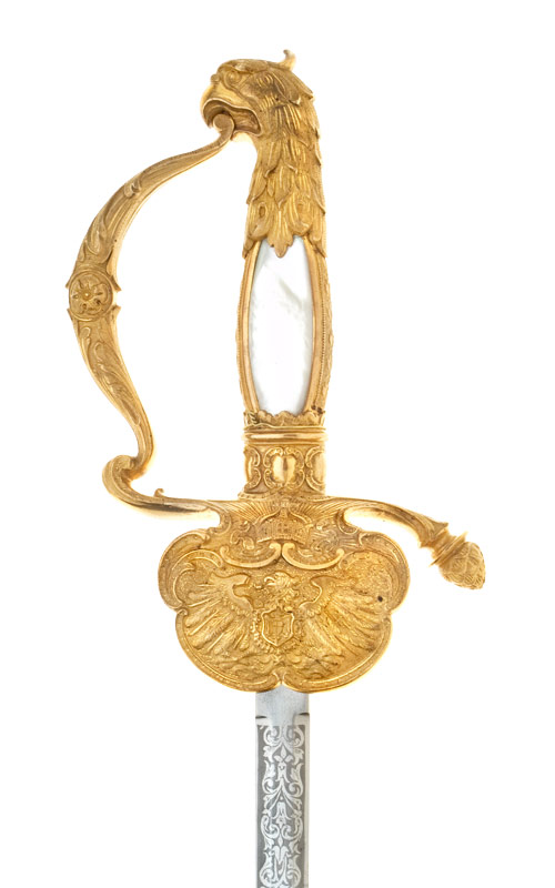 Messinggefäss vergoldet, Knaufkappe mit Adlerkopf, Griffbügel in Parierstange mit pinienzapfenförmigem Abschluss übergehend, ortwärts gebogenes Stichblatt, Dekor: grosse Darstellung des von der Kaiserkrone überhöhten Reichsadlers. Griff mit Perlmuttplatten belegt, seitlich Messingschienen.