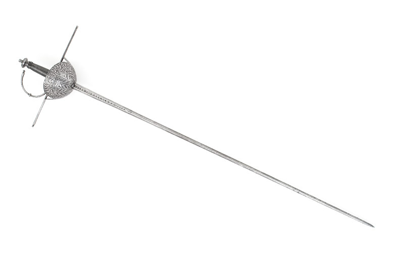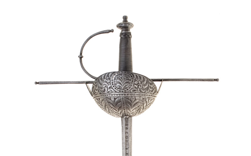 Eisengefäss, gequetschter, kugeliger Knauf mit Halsansatz und hohem Vernietknauf, der offene Griffbügel mündet in die lange Parierstange, beide aus schmalen Rundeisen, beide weisen kleine Kugelabschlüsse auf. Die grossen Griffringe enden in einer scheibenartigen Basis, spanisch als «guardapolvo» bezeichent, die im Stichblattinnern zweifach verschraubt wurde. Die Oberkante des halbkugelförmigen, glockenartigen Stichblattes ist gelappt. Die Aussenseite der Glocke wird durch radial angelegte schmale Bänder mit Punktdurchbrechungen in zehn Segmente unterteilt. Die Glockenfläche schmückt ein geschnittener einfacher, ornamentaler Blätter- und Rankendekor. Griff mit Eisendrahtwicklung, geflochtene Abschlüsse, sog.Türkenbünde.