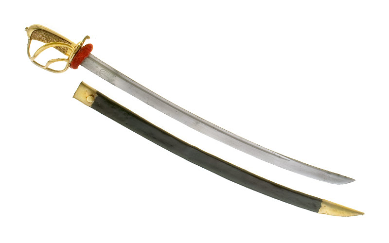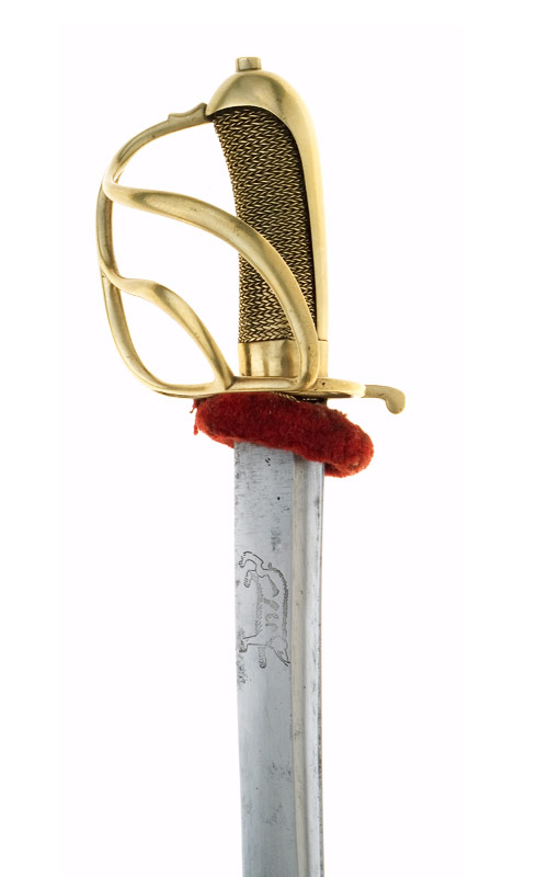 Rückenklinge (Länge 65 cm, Breite 3,2 cm), Hohlschliff im Rückenbereich, im Ort zweischneidig, Grootspitze, beidseitig gleicher Ätzdekor: in Richtung Ort schreitender Bär. Schwarze Lederscheide, Anfang 19.Jh., Messinggarnitur, Mundblech mit Tragknopf, Stiefel. Die rote, am Parierbügel festgenähte Regenschlaufe und das Schlagband sind ebenfalls in den Anfang des 19.Jahrhunderts zu datieren. Schlagband, wohl für Unteroffizier: weiss-rote Baumwollkordel, Troddel oben mit weissem Wollring, rote Fransen.