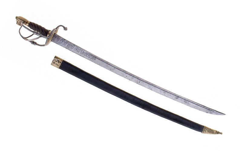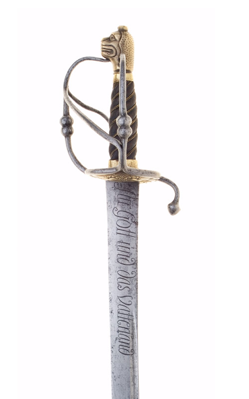 Eisengefäss, gegossener Löwenkopfknauf aus Messing, Griff- und separater Seitenbügel sind durch eine diagonale Spange miteinander verbunden und münden in die Parierstange resp. das Stichblatt. Griff- und Seitenbügel aus Rundeisen weisen als Dekor je ein kleines Kugelpaar auf. Parierstange mit Knopfende ortwärts gebogen. Quartseitig eine weitere Spangenverbindung zwischen Griffbügel und Stichblatt, dazu ein Daumenbügel. Zweiteiliges Stichblatt, die nierenförmigen Stichblätter aus Messingblech von leicht unterschiedlicher Grösse wurden in Rundeisenfassungen fixiert. Die Bleche weisen einen einfachen, ziselierten ornamentalen Dekor auf. Spiralig gerillter Holzgriff mit einfacher Messingdrahtwicklung, zwei Zwingen.