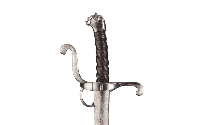 Eisengefäss, geschnittener Knauf, einfache stilisierte Löwenkopfform. Offener, halblanger, S-förmig geschweifter, flacher Griffbügel in Parierstange mit ortwärts gebogenem Ende übergehend. Auf der Vorderseite ein grosser, ebenfalls flacher Parierring, auf der Rückseite eine Spange kombiniert mit einem Daumenbügel. Lederbespannter, spiralig gerillter Griff. Rückenklinge (Länge 97,2 cm, Breite 3,9 cm), breiter Hohlschliff, Rückenabsatz, Klinge im Ortdrittel zweischneidig.