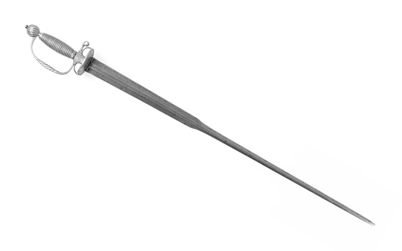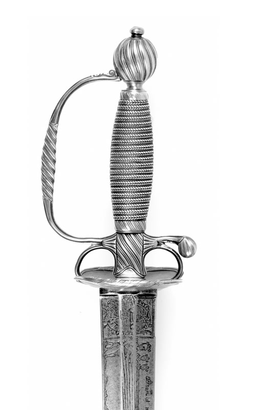 Silbergefäss, aus gegossenen, ziselierten Teilen zusammengesetzt. Kugeliger Knauf, Vernietknäufchen. Der Griffbügel mündet in die Griffbasis, Parierstangenarm mit gerundetem Ende, zwei Griffringe, zweiteiliges aus nierenförmigen Hälften bestehendes Stichblatt. Der Knauf, das Mittelstück des Griffbügels, ebenso die Griffbasis und die Zwingen weisen einen Rillen- und Bänderdekor, teilweise «en torsade» auf. Griffwicklung und Griffzwingen ebenfalls aus Silber.