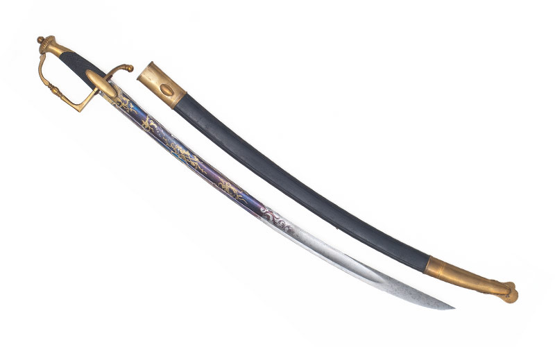 Rückenklinge (Länge 73,3 cm, Breite 3,1 cm), breiter Hohlschliff, Ansatzhälfte gebläut, vergoldeter Ätzdekor: Signatur, « Gebr.Weyersberg in Solingen», Trophäen, Rankenwerk. Schwarze Lederscheide, Messinggarnitur vergoldet, berieben, Mundblech mit Tragknopf, Stiefel mit Schlepper.