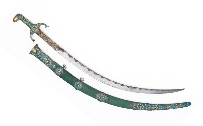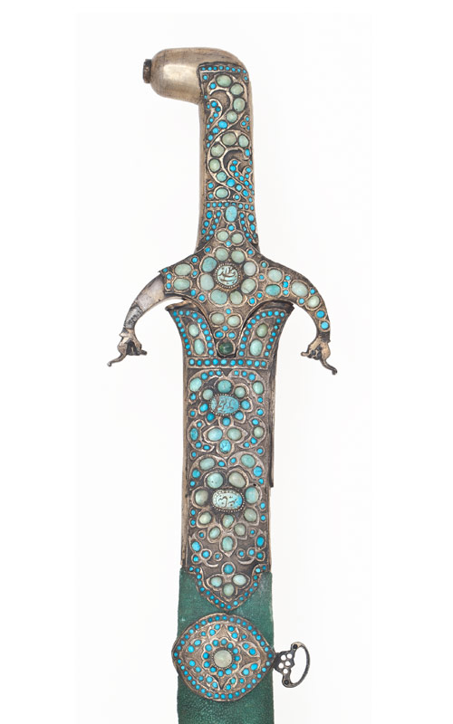 Volle Damastrückenklinge (Länge 81,1 cm, Breite 3 cm), auf der Vorderseite im Bereich des Ansatzviertels ein geschnittener ornamentaler, symmetrisch gestalteter Blumen- und Blätterdekor, ebenfalls nur auf der Klingenvorderseite dem Rücken entlang bis zum Ort eine Folge von ca. 18 kleiner werdenden geschnittenen Dekordreiecken. Schnittdekor vergoldet. Mit grün getönter Fischhaut (franz. «le galuchat») bespannte Scheide, Silbergarnitur, Mundblech, zwei spitzovale Ringbänder, ein zusätzliches Dekorband, langer Stiefel. Die Vorderseite der Garnitur schmücken ca. 500 Türkise von unterschiedlicher Grösse, gruppiert in Rosetten und Blumen. Die zentralen Steine von drei Dekorelementen weisen gravierte arabische