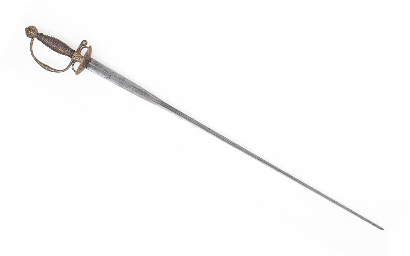 Dreikantige Klinge (Länge: 79,7 cm, Breite 2,7 cm), sogenannte «Colichemardeklinge» (vgl. Kat. Nr. 40), tief gekehlte Seitenflächen, Ätzdekor.