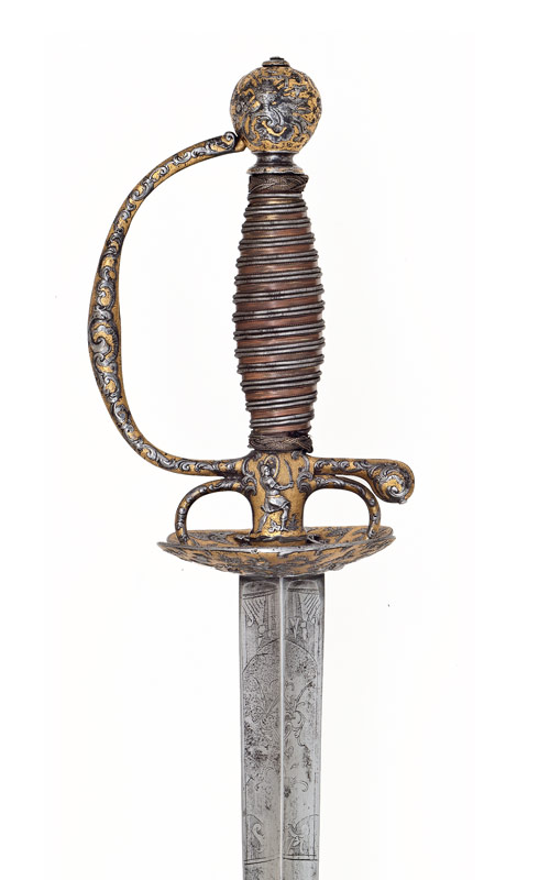 Eisengefäss, aus gegossenen, ziselierten Teilen zusammengesetzt, teilvergoldet. Kugeliger Knauf, konische Basis, Vernietknauf. Der Griffbügel mündet in die Griffbasis; der Parierstangenarm endet in einem kugeligen Abschluss, zwei Ziergriffringe, Stichblatt aus nierenförmigen Hälften bestehend. Auf dem Knauf beidseitig Darstellungen von Trophäen, auf der Griffbasis Medaillons mit Kriegern in antikisierenden Kostümen und entsprechender Bewaffnung. Stichblattdekor: Aussenseite – auf den Stichblatthälften je ein berittener, mit einem Bogen bewaffneter Krieger, dazu Trophäen und Säule. Innenseite – auf der linken Stichblattseite ein stehender Krieger vor einem gefallenen Gegner, daneben Baum und Sonne, die rechte Stichblatthälfte zeigt einen berittenen Krieger sowie ein Vasenmonument nebst einem Baum. Die restlichen Flächen bedecken Rocaillenfolgen. Griff mit kombinierter Bänder-Drahtwicklung aus Eisen und Kupfer.