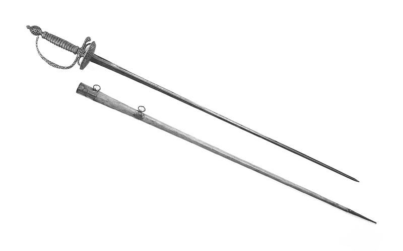 Dreikantige Klinge (Länge 75,6 cm, Breite 2,1 cm), tief gekehlte Seitenflächen, Ätzdekor. Lederbespannte Scheide, Eisengarnitur, Mundblech mit Tragring, Ringband, Stiefel. Dazu ein «en suite» gearbeitetes Traggehänge aus Eisen.