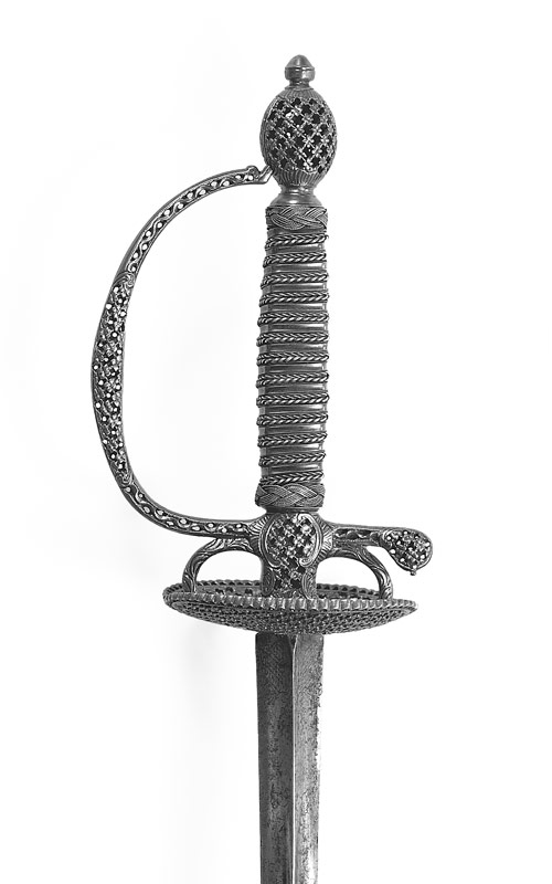Eisengefäss, aus geschmiedeten, durchbrochen gearbeiteten und ziselierten Teilen zusammengesetzt. Olivenförmiger Knauf, konische Basis, Vernietknauf. Der Griffbügel mündet in die Griffbasis, der Parierstangenarm endet in einem gerundeten Abschluss, zwei Ziergriffhaken, Stichblatt aus nierenförmigen Hälften bestehend. Der Knauf, das Mittelstück des Griffbügels, Griffbasis, Parierstangenarm und Stichblatt weisen einen regelmässigen, fein gegitterten, aus vierblättrigen Blüten bestehenden Dekor auf, die restlichen Flächen sind mit Wellenlinien, Punkten und andeutungsweise mit Rocaillen verziert, Stichblattrand fein gekerbt. Griff mit Silberdraht und gebläuter Eisenbandwicklung, Türkenbünde.