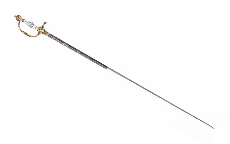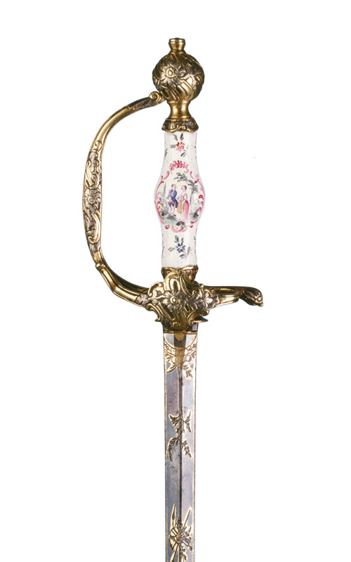 Die etwas zu lange und zu schwere Klinge, deutsch 2. Viertel 19. Jahrhundert, wurde ergänzt. Ein Galadegen mit identischem, möglicherweise unter Verwendung gleicher Formen, zumindest aber in der gleichen Werkstatt hergestelltem Gefäss findet sich bei Lhoste, Nr. 363, «Epée de ville, vers 1760». Das formal ebenfalls gleiche, weiss emaillierte Griffstück unterscheidet sich nur hinsichtlich des Dekors. Für die Gefässe dieser verspielten deutschen Rokokodegen fanden sowohl Griffstücke aus emailliertem Kupfer als auch Porzellan Verwendung.