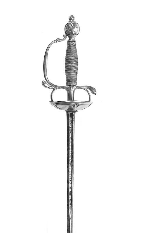 Späte Form eines Degens mit schalenartigem Stichblatt und grossen Griffringen, der in der spanischen Tradition des späten 17. Jahrhunderts mit einer Stichklinge ausgestattet wurde. Als Schmied, der in spanischer Sprache beschrifteten und signierten, für den Export bestimmten Klinge erscheint ein «Pedro Poeter en Solingen». Um 1600 war in Solingen ein Schwertschmied namens Peter Potter, auch «Paeter» oder «Paether», tätig, der zwei unterschiedliche Eulen-Marken verwendete. 1640 leistete dessen Sohn Clemens den Handwerkseid als Schwertschmied. Weitere Mitglieder der Solinger Schwert- und Messerschmiedefamilie «Poeter» lassen sich von 1684 – 1861 vor allem mit Hilfe der Messermacher-Rolle feststellen. Ein nicht namentlich nachweisbares Familienmitglied mit dem Vornamen Peter dürfte die für diese Waffe benützte Klinge, welche typologisch und verarbeitungsmässig spanischen Rapierklingen zu Ende des 17. Jahrhunderts entspricht, hergestellt haben.