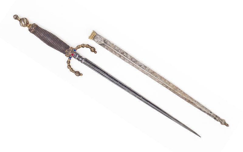 Volle Dreikantklinge (Länge 31,5 cm, Breite 1,2 cm), Seitenflächen mit tiefen Kannelüren und Punktdurchbrechungen. Klingenwurzel vierkantig, mehrfach gekehlt. Silberscheide, teilvergoldet, Mundbereich vierkantig, dann dreikantig, rückwärtige Tragöse, Ortknopf in der Art des Knaufs. Auf den beiden Scheidenvorderseiten gravierte, symmetrisch angeordnete Blätterfolge. Die mehrheitlich glatte Rückseite weist im Mund- und Ortbereich einen einfachen, ornamentalen, gravierten Dekor auf. Gravierte Jahrzahl «1725» und das Besitzermonogramm «MET» unter einem Kreuz in einer Kartusche, viermal die venezianische Silberbeschau, verwischt.