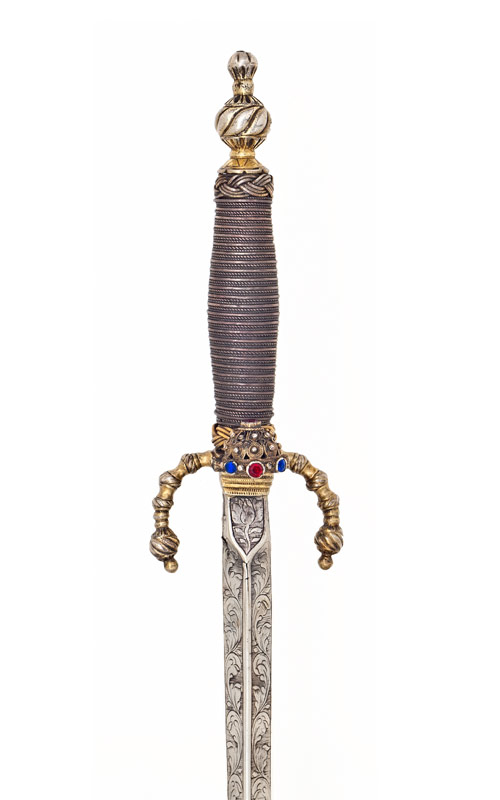 Silbergefäss, aus gegossenen und ziselierten Teilen zusammengesetzt, vergoldet, berieben. Kugeliger Knauf mit konischen Ansätzen, Knaufbasis ebenfalls konisch. Dekormittelband mit Zierrillen und Wulsten, langer, gegliederter Vernietknauf. Parierstangenarme gerundet, genoppt und stark ortwärts gebogen, Enden in der Art des Knaufs gearbeitet. An der Griffbasis angelötetes Zierelement: über einer runden, zehnteiligen Rosette bilden Plättchen aus gerolltem Silberdraht eine kleine Halbkugel, auf der Unterseite zweimal die venezianische Silberbeschau, in der Mitte der Halbkugel und an der Basis gefasste, bunte Glassteine. Griff mit Silberdrahtwicklung, Türkenbünde.