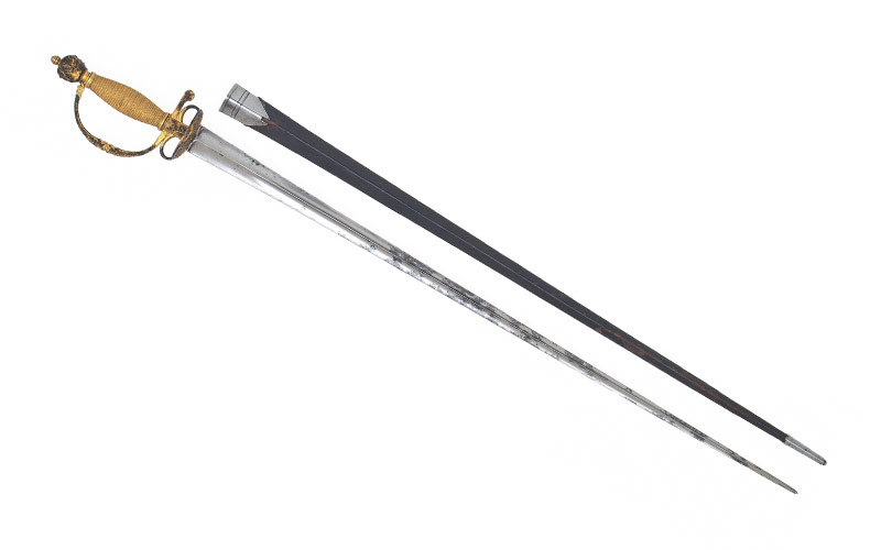 Dreikantige Klinge (Länge 78,3 cm, Breite 3,3 cm), tief gekehlte Seitenflächen. Schwarze Lederscheide, Eisengarnitur, Mundblech und Stiefel.