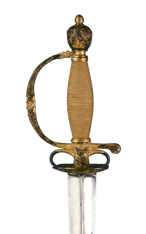 Sawasa-Gefäss, aus gegossenen, ziselierten, vergoldeten und lackierten Teilen zusammengesetzt. Vasenförmiger Knauf, Halsansatz, Vernietknauf. Der Griffbügel mündet in die Griffbasis, Parierstangenarm mit gerundetem Ende, zwei Ziergriffringe, Stichblatt mit nierenförmigen Hälften. Alle Gefässteile weisen einen feinziselierten, etwas reliefierten, schwarz gelackten Dekor auf. Der fein gekörnte Grund wurde vergoldet. Der Dekor setzt sich aus blütenbesetztem, mehr oder weniger dicht angeordnetem Astwerk sowie Folgen von Blütenzweigen, Vögeln, Käfern und stilisierten Pagoden zusammen. In der Mitte des flachen, teilweise gerundeten Griffbügels Darstellung einer kleinen, stilisierten Sonne. Griff mit feiner vergoldeter, eventuell ergänzter Drahtwicklung, zwei Zwingen.