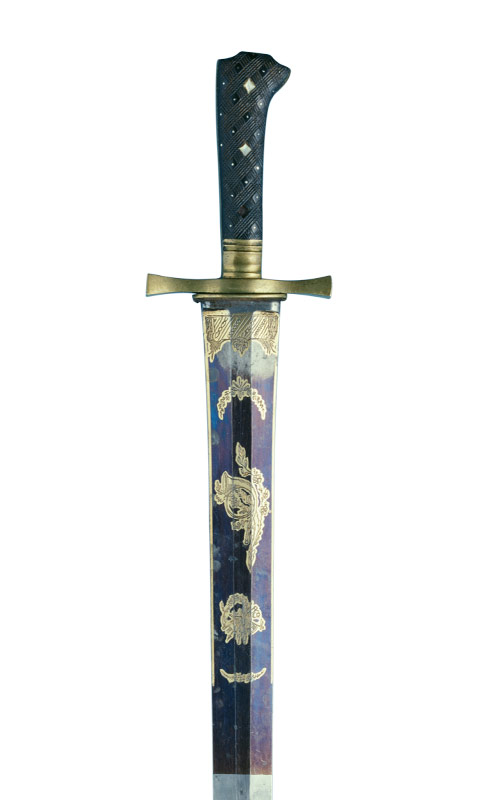 Messinggefäss, aus gegossenen und geschmiedeten Teilen zusammengesetzt, Angel beidseitig mit schwarzen Hornplatten belegt. Die Platten weisen einen geschnittenen Dekor, ¬bestehend aus gebündelten Linien, auf, die sich diagonal kreuzen, dazu einige kleine Perlmutteinlagen sowie ein Dekor aus Silberstiften. Die Griffbasis ist vierkantig und wird auf den Aussenseiten von Rillen durchzogen. Vierkantige Parierstange mit breiter werdenden Armen.