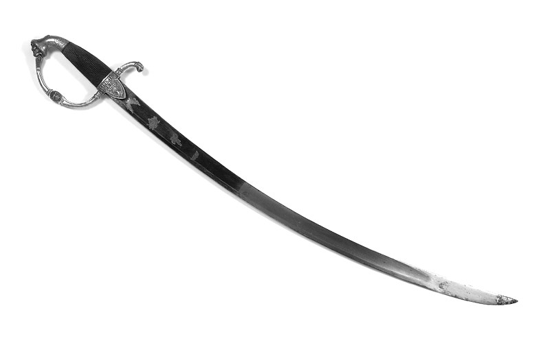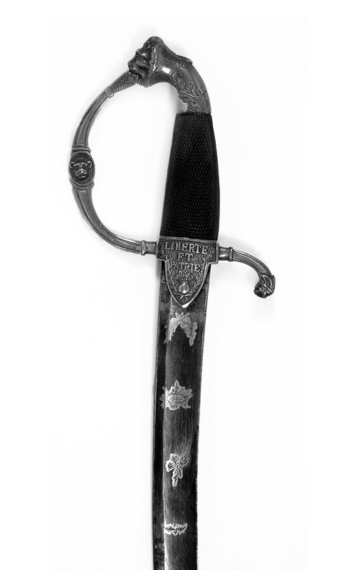 Messinggefäss, aus gegossenen und ziselierten Teilen zusammengesetzt, vergoldet, berieben. Vierkantige Knaufkappe mit Löwenkopfabschluss, seitlich Blattwerkdekor, flacher, vierkantiger Griffbügel, im Zentrum mit Löwenkopfdarstellung, in die Parierstange übergehend. Beidseitig der Griffbasis grosse Lappen, Dekor auf der Vorderseite: Devise «LIBERTE ET PATRIE» über einer platzenden Granate, von Zweigen umrahmt. Schwarzer, vierkantiger Holzgriff, auf der Vorder- und Rückseite geschnittene Waffelmuster.