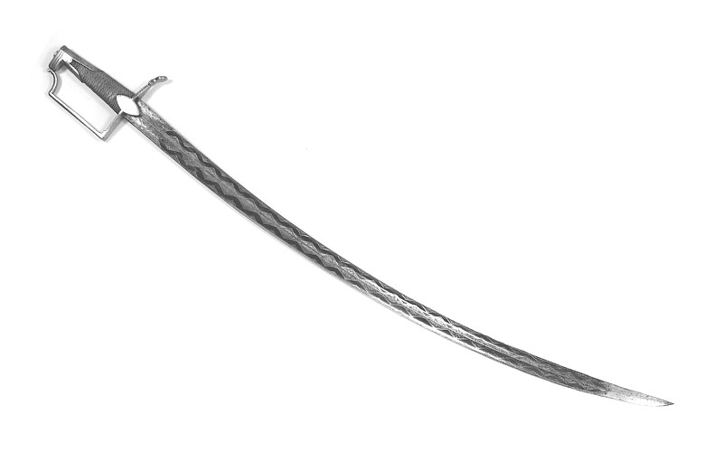 Rückenklinge (Länge 85,5 cm, Breite 3,4 cm), Mittelgrat zwischen zwei breiten Hohlschliffen. Der geätzte, gebläute und vergoldete Dekor bedeckt beinahe die ganze Klinge: Klingenwurzel mit Kriegerdarstellung, anschliessend ein aus rhombischen Balkenvierecken bestehendes Muster, das sich bis zum Ort hinzieht.