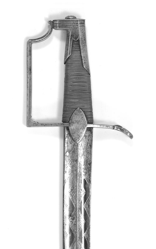 Dieser Gefässtyp mit der charakteristischen «exzentrischen», lappenbestückten Knaufkappe, einem gewinkelten Griffbügel und Mitteleisen scheint französischen Ursprungs zu sein. Datierte Belegstücke verdanken wird dem Umstand, dass nachweislich seit März 1793 vom französischen Nationalkonvent, später vom Direktorium, auch den Konsuln und schliesslich von Kaiser Napoleon an verdiente Militärs geschenksweise Säbel abgegeben wurden. So erhielten auf Veranlassung des Direktoriums 1796 der «Citoyen Laurent Réaux: dit Bel Etoile», eingeteilt beim 5.Dragonerregiment sowie 1797 der Bataillonschef C. Ficher (für Fischer?) als Belohnung einen Ehrensäbel. Die Gefässe beider Waffen entsprechen dem Modell mit exzentrischer Knaufkappe etc., wobei der Säbel des Bataillonschefs von der «Manufacture à Versailles» geliefert wurde. Das zur Zeit des Direktoriums (1795 – 1799) möglicherweise in der seit 1793 von Boutet geleiteten Versailler Manufaktur entwickelte und bis in die ersten Jahre des Kaiserreiches hergestellte Säbelmodell fand vor allem bei berittenen Truppen Verwendung. Die in der Manufaktur von Versailles, generell in Paris bis zum Ende des Kaiserreiches kreierten Griffwaffen wurden in vielen Ländern des von Frankreich dominierten Kontinentaleuropa nachgeahmt. Obschon die vorliegende Waffe, vor allem das Gefäss, französischen Vorbildern verpflichtet ist, könnte es sich auch um ein deutsches Erzeugnis handeln.